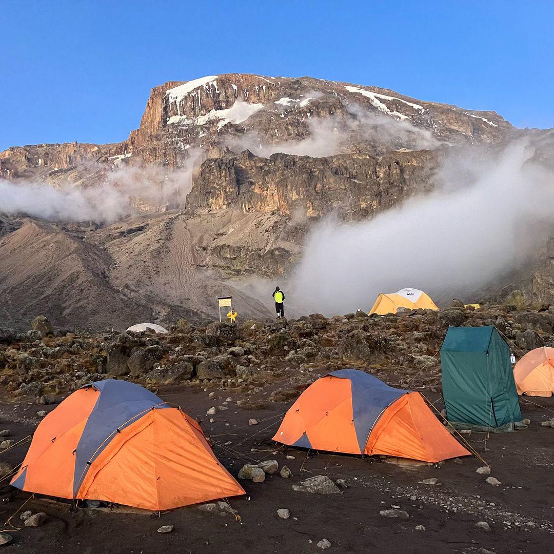 Today’s journey is a moderate trek across expansive sections of the Shira Plateau, covering about 7 km in 4 to 5 hours. The trail provides spectacular views of Kibo Peak to the east and the rugged Shira Ridge to the west. The terrain consists of rocky paths, open plains, and gentle inclines surrounded by sweeping vistas and unique high altitude vegetation. You will gradually ascend to Shira 2 Camp at 3,840 meters, where the views become even more impressive as the cloud cover shifts below you. Dinner and overnight stay are provided at the camp.
